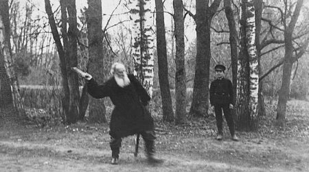 Толстой играет в городки. Фотография Т. Тапселя. 1909. Ясная Поляна