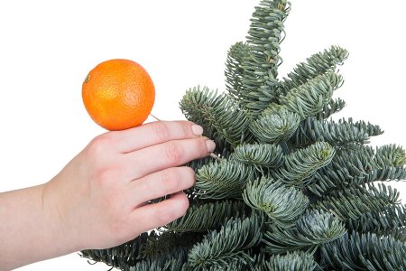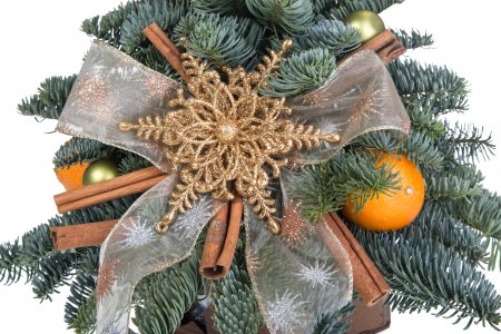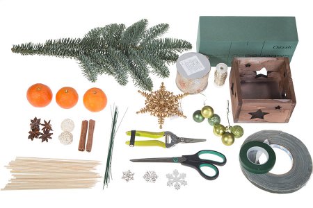 Для того чтобы создать новогоднее настроение, совсем не обязательно рисовать на окнах гуашью или зубной пастой и сооружать бумажные гирлянды. Стильным украшением дома и праздничного стола может стать новогодняя композиция в виде елки, которую несложно собрать из натуральных и легко добываемых материалов. Мастер-класс по созданию новогоднего украшения своими руками покажет, как это сделать. Нам понадобятся: несколько веток ели мандарины корица и бадьян небольшие ротанговые и стеклянные елочные шары, декоративные снежинки (или любые другие украшения на ваш вкус) кашпо флористическая губка оазис деревянные шпажки тонкая проволока-бульонка небольшой отрезок полиэтиленовой пленки секатор и ножницы тейп-лента флористический скотч Первым делом надо подготовить оазис, в котором еловые ветки будут стоять долго, радуя глаз. Из прямоугольного куса оазиса ножом создаем форму будущей ели — конус. Теперь можно замочить оазис в воде. Делайте это правильно — надписью вверх, не нажимая на губку, она должна погрузиться в воду сама, чтобы внутри не осталось сухих участков. Хорошо впитавший воду оазис устанавливаем в кашпо, предварительно проложив полиэтилен — чтобы композиция не протекала. Торчащие из кашпо края пленки нужно отрезать. Для того чтобы новогодняя композиция не падала при перемещении или транспортировке, хорошенько закрепляем оазис в кашпо анкор-скотчем. Разбираем еловые ветви по размеру и втыкаем их иголками вверх во флористическую губку: крупные ветки вниз, маленькие сверху. Удобно делать это по кругу или по спирали — тогда незаполненных участков не останется. Теперь добавим нашей композиции новогоднего декора. Мандарины насаживаем на деревянные шпажки и пристраиваем в оазис. Перехватываем декоративную ленту проволокой и формируем бант, с помощью клея или проволоки прикрепляем к банту звезду или любое другое яркое новогоднее украшение. Специи также прикрепляем на шпажки или проволоку, находим им выигрышное место на нашей самодельной елке. Новогодняя композиция готова! Обзор