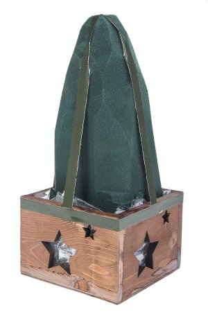 - Первым делом надо подготовить оазис, в котором еловые ветки будут стоять долго, радуя глаз. Из прямоугольного куса оазиса ножом создаем форму будущей ели — конус. Теперь можно замочить оазис в воде. Делайте это правильно — надписью вверх, не нажимая на губку, она должна погрузиться в воду сама, чтобы внутри не осталось сухих участков. Хорошо впитавший воду оазис устанавливаем в кашпо, предварительно проложив полиэтилен — чтобы композиция не протекала. Торчащие из кашпо края пленки нужно отрезать.