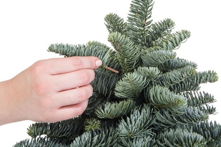- Разбираем еловые ветви по размеру и втыкаем их иголками вверх во флористическую губку: крупные ветки вниз, маленькие сверху. Удобно делать это по кругу или по спирали — тогда незаполненных участков не останется.