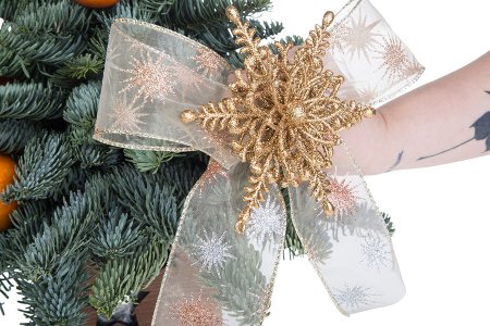 - Перехватываем декоративную ленту проволокой и формируем бант, с помощью клея или проволоки прикрепляем к банту звезду или любое другое яркое новогоднее украшение.