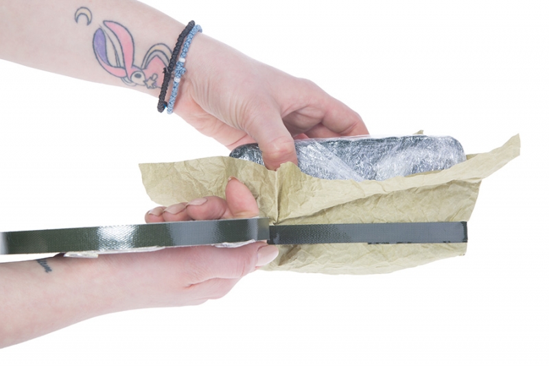 - Будущий низ изделия маскируем упаковочной бумагой, декорируем лентой — в этом нам поможет двусторонний скотч.