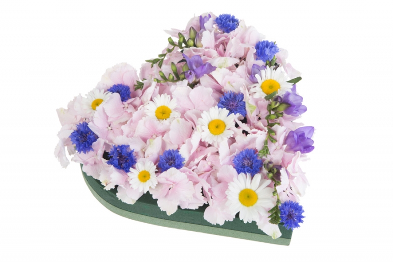 Пожалуй, ромашки — одни из самых жизнерадостных цветов. А с недавних пор их выбрали официальным символом Дня семьи, любви и верности, который ежегодно отмечается 8 июля, в период кульминации цветения полевых растений. Если вы отмечаете этот новый для России праздник или просто хотите порадовать свою вторую половинку и создать в городской квартире луговое настроение — предлагаем решение. Цветочная композиция в виде сердца сохранит свежесть не один день и запомнится надолго. Как сделать этот необычный букет своими руками, рассказывают специалисты компании "Флорист.ру". Вам понадобятся: гортензия розовая, васильки, ромашка, ваксфлауэр белый, фрезия синяя, роза кустовая розовая, астранция розовая флористическая губка оазис в форме сердца фетр декоративная бечевка декоративные металлические сердца горячий клей декоративные булавки шпажки Перед началом работы оазис в форме сердца заранее опускаем в емкость с водой, самостоятельно руками не топим, ждем, пока жидкость равномерно впитается. Примерно через 20 минут, когда губка пропиталась водой, она готова для дальнейшей работы. Прежде чем приступить к созданию композиции, цветы необходимо подрезать под острым углом для того, чтобы они увлажнялись и сохраняли свежесть. В первую очередь разделяем розовую гортензию на отдельные соцветия. Начинаем заполнять ими всю поверхность оазиса, при этом оставляем места для других цветов. Далее создавая контраст, сажаем во флористическую губку фрезию. После этого украшаем васильками, ромашками, присоединяем к ним розы, астранцию. Не забудьте про милые цветочки ваксфлауэр — они идеально дополнят букет своими руками. Цветы в композиции должны помещаться плотно друг другу, но не перекрывать друг друга. Теперь, когда сердце заполнилось цветами, оформляем его фетром по бокам. Для этого вырезаем небольшие квадраты из фетра и с помощью горячего клея прикрепляем их на боковую часть оазиса. Кроме цветов в нашей композиции будут присутствовать декоративные сердечки. Их также с использованием горячего клея насаживаем на шпажки, затем аккуратно вставляем между цветами в оазис. В завершении обматываем цветочную композицию бечевкой и на лицевой стороне завязываем небольшой аккуратный бантик. Наш подарок на День семьи, любви и верности готов радовать и поднимать настроение. Губка, в которой находятся цветы, испаряет влагу, поэтому поливайте цветы раз в два или три дня и берегите композицию от прямых солнечных лучей. Авторская статья