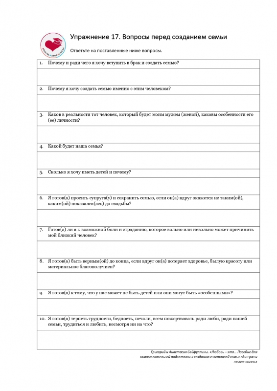 Подготавливаясь к семейной жизни, важно задать себе ряд очень серьезных вопросов. Будет полезно, если ответы на эти вопросы найдет каждый будущий(ая) суруг(а) самостоятельно.
