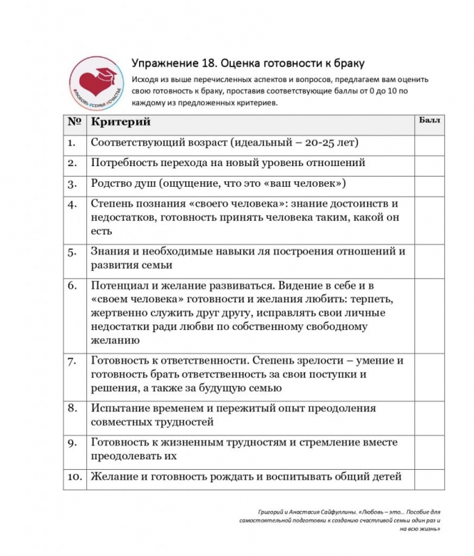 Причин тому много. Но истоки проблемы, пожалуй, в другой, противоположной по смыслу формулировке — не когда пора разводиться, а когда пора жениться. Если бы будущие супруги более серьезно подходили к построению отношений, то, вероятно, это избавило бы их не ото всех, но от многих проблем в будущем. Сегодня большой популярностью пользуются курсы профессионального роста, тренинги развития и стратегические сессии, помогающие навести порядок в делах, и, к сожалению, меньший интерес вызывают курсы, связанные с построением отношений (это потом, когда проблемы невозможно не замечать, люди спешат к психотерапевтам и включаются в работу групп поддержки групп поддержки). Книга «Любовь – это… Пособие для самостоятельной подготовки к созданию счастливой семьи один раз и на всю жизнь» – уникальная программа, без дидактики и морализаторства, но с пониманием и принятием чувств молодых людей вступающая в диалог с читателем. Просто и логично поданные теоретические выкладки (более 200 книг и статей по теме изучили авторы), примеры из жизни, практические задания позволяют человеку — юному и не очень — разобраться в себе и не наделать ошибок, которые заставят через много лет обижено пенять в сторону мужа или жены: «ты мне всю жизнь испортил(а)!» Авторы книги — супруги Григорий и Анастасия Сайфуллины — не хотят учить, они хотят поделиться тем, чему научились сами, двигаясь по своей семейной траектории, и о чем рассказывают теперь в рамках организованных ими в 2012 году интенсив-курсов «Любовь. Семья. Счастье». Книга, как говорится, рассчитана на широкого читателя: маст-хэв в доме, где есть подросток, и будет полезным практикумом как для молодых людей со статусом «личная жизнь — все сложно», так и для тех, у кого уже «все серьезно». Книга «Любовь – это…» состоит из 5 разделов (каждый — по 7 глав), затрагивающих темы от поиска избранника до создания семьи. Журнал «Батя» публикует фрагмент, посвященный уже озвученному выше вопросу – когда пора жениться? Первый тираж книги не был выведен в свободную продажу. Но сейчас готовится второе издание, которое будет доступно в книжных розничных и интернет-магазинах. По всем вопросам можно обращаться к авторам книги. Когда пора создавать семью? 10 важнейших аспектов Вопрос готовности к созданию семьи, конечно, очень индивидуален. К созданию семьи необходимо подходить осознанно и ответственно. В то же время нужна определенная решительность и важна своевременность принятия такого важного жизненного решения. Помогут определить готовность к созданию семьи следующие критерии: 1. Возрастные границы. Несмотря на то, что фактический средний возраст вступления в первый брак у современных россиян сдвинулся к 25 годам у женщин и к 28 годам у мужчин, наиболее благоприятным возрастом для создания семьи считается возраст 20-25 лет. И вот почему: — Пластичность характера. В этот период легче подстроиться друг под друга в образе жизни и поведении, «притереться» характерами. После 25 лет, как правило, легче отказаться от отношений, чем от своих закоренелых привычек и стереотипов. — Расцвет репродуктивного возраста. Это наиболее благоприятный возраст для рождения детей. С позиции физиологии женского организма такие важные процессы, как беременность, роды, грудное вскармливание и уход за малышом, проходят гораздо легче*. С другой ст