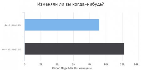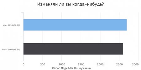 Но первый же вопрос «Изменяли ли вы когда-нибудь?» в нашем опросе показал, насколько устарели эти убеждения. Мы все уже давно живем в совершенно другом мире. Так вот, на него ответили утвердительно 50,8% опрошенных мужчин, и, внимание — 42,8% женщин.