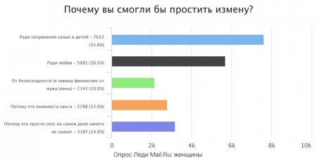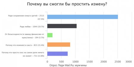 Результаты последнего вопроса: «Ради чего вы смогли бы простить измену?» тоже удивляют. С огромным отрывом от всех остальных лидирует вариант ответа: «Ради сохранения семьи и детей». Так ответили 47,4% мужчин и 35,6% женщин.