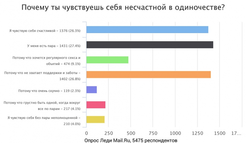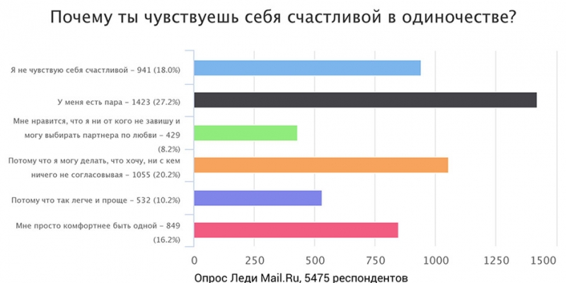 Тем не менее, 35.3% опрошенных утверждают, что счастливы и в одиночестве, и лишь 15.4% признались, что несчастны.