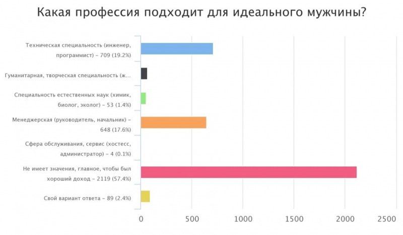 Если спросить у женщин, какая профессия подходит для идеального мужчины, то окажется, что это не важно. Главное, чтобы был хороший доход — такой вариант ответа выбрали 57,4% женщин.