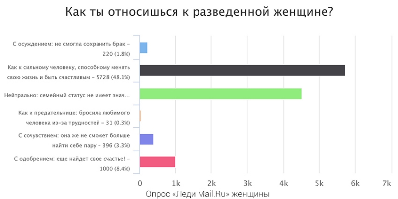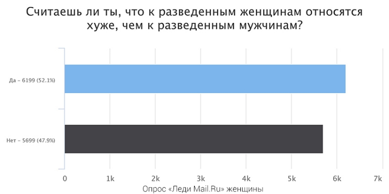 Отличается ли все же отношение к разведенным мужчинам и женщинам? Мнения разделились. Мужчины в основном ответили, что семейный статус не имеет значения. А женщины относятся к разведенным — как к сильным личностям, способным менять свою жизнь.