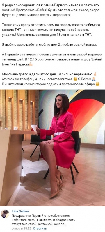 27 ноября 2017 года телеведущая Ольга Бузова дала комментарии относительно своего ухода с телеканала ТНТ, о чем общественности было известно уже несколькими неделями ранее. В Интернете уже давно не перестают ходить сплетни, касающиеся того, что Бузова намеревается распрощаться со своей должностью проектной ведущей. Если прежде большинство ее поклонников полагали, что Ольга слишком увлеклась творчеством и никак не в силах успевать все одновременно, то теперь зашла речь о том, что молодая женщина решила самым обыкновенным образом поменять ТНТ на Первый телеканал. Ни для кого уже не является тайной тот факт, что Бузова получила приглашение участвовать в качестве телеведущей в новом телевизионном шоу «Бабий бунт». Сама Ольга видит в таком назначении только старт предстоящей ей грандиозной карьеры и откровенно намекает на то, что ее ожидают и более перспективные предложения. В то же время Бузова категорически отрицает возможность ухода с телепередачи. По ее собственным словам, канал ТНТ был для нее настоящей семьей и домом в течение 13 лет, и совершить подобное предательство она однозначно не способна. Свое мнение о том, какое будущее предстоит Ольге Бузовой на телевидении, вы можете изложить в комментариях.