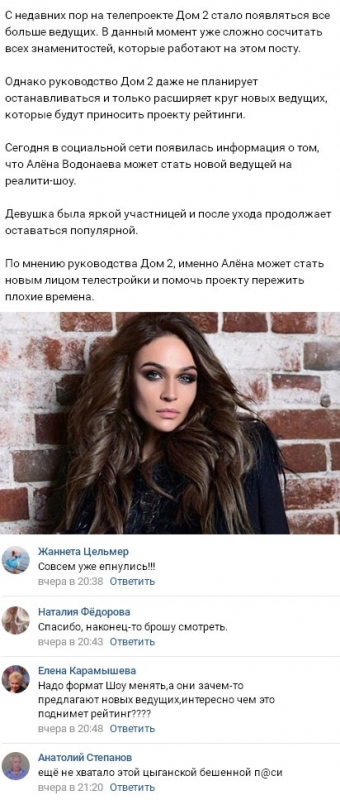 7 декабря 2017 года журналисты узнали, кому именно из звезд предстоит стать новой телеведущей реалити-шоу. Негодование поклонников проекта по поводу того, что на передаче теперь присутствует слишком много ведущих, судя по всему, абсолютно не беспокоит организаторов телепрограммы. Во всяком случае, в виртуальном пространстве уже имеются слухи, касающиеся нового назначения. При этом всего лишь несколько недель назад приглашение на соответствующую должность получила Юлия Ефременкова, а несколько ранее то же самое произошло и с Либерж Кпадону. Читайте также: Смотреть онлайн Дом-2 9 декабря 2017 Исходя из информации, размещенной в СМИ, на этот раз для этой серьезной роли оказалась избранной Алена Водонаева, что никак нельзя считать случайностью. Руководители телестройки прекрасно помнят о том, что в свое время Водонаева являлась одной из наиболее популярных обитательниц периметра, а теперь, по их мнению, она станет вполне достойной конкуренткой для Ксении Бородиной и Ольги Бузовой. Организаторы телешоу не скрывают, что связывают с Аленой немалые надежды, причем они нисколько не сомневаются, что она сумеет помочь телепроекту пережить сегодняшний, явно не самый благоприятный для телепрограммы период. Свое мнение о том, желаете ли вы увидеть Алену Водонаеву в числе ведущих телепередачи, вы можете высказать в комментариях.