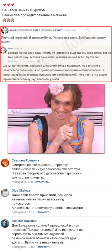 10 декабря 2017 года поклонники реалити-шоу наконец сумели выяснить, куда же исчез Венцеслав Венгржановский. В течение длительного времени фанаты могли только строить предположения о том, куда отправился этот молодой человек после ухода с телестройки. Несколько месяцев назад в виртуальном пространстве возникли сплетни о том, что судьба Венгржановского сложилась не самым лучшим образом. Более того, парень, лишившийся и работы, и жилья, вынужден вести существование обыкновенного бомжа. Смотрите также: Смотреть онлайн Дом-2 13 декабря 2017 Однако телезрители немного успокоились, когда Венцеслав все же связался с Рустамом Калгановым. Молодой мужчина без труда убедил прежнего товарища по телепередаче в том, что у него все в порядке, правда, ему пришлось покинуть столицу и вернуться к себе на родину, в Краснодар. Но сведения, полученные из достаточно достоверного источника, многих не только огорчили, но и испугали. Стало известно о том, что Венгржановский в настоящее время проходит курс лечения в психиатрической лечебнице, и пока неясно, когда он сумеет вернуться к нормальной, полноценной жизни. Свое мнение о ситуации, в которой оказался Венцеслав Венгржановский, и об его дальнейших перспективах вы можете изложить в комментариях.