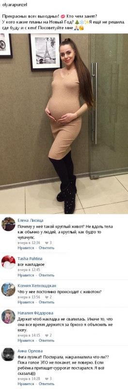 Живот Ольги подписчики ехидно сравнили с чупа-чупсом. К тому же многие отметили, что этот орган молодой женщины живет собственной жизнью и регулярно меняет форму, что случается неоднократно на протяжении всего лишь одной недели. Такие трансформации, по мнению телезрителей, только подтверждают тот факт, что в действительности Рапунцель вовсе не ожидает младенца.