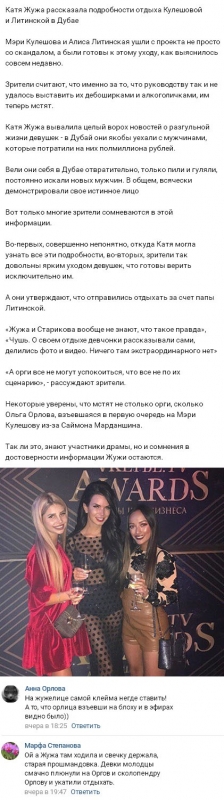 После расставания с телешоу Литинская и Кулешова немедленно погрузились в свободную, без всяких ограничений жизнь и поспешили отправиться на отдых в Дубаи. Екатерина Жужа сообщила приверженцам телепрограммы о том, как девушки провели там время и кто оплатил им роскошный отпуск. Как утверждает Катя, Мэри и Алиса прибыли в Объединенные Арабские Эмираты в сопровождении состоятельных мужчин, потративших едва ли не полмиллиона рублей ради удовлетворения всех капризов бывших участниц телепередачи. К тому же, находясь в Дубаи, Литинская и Кулешова по-прежнему были заняты поиском обеспеченных представителей сильного пола, желая продлить пребывание на отдыхе.
