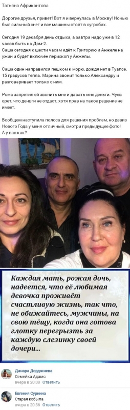 Реакция молодого человека на столь некорректное поведение потенциальной тещи не заставила долго себя дожидаться. Хотя в присутствии других людей Капаклы всегда старается держаться максимально вежливо и никак не задевать старшую Африкантову, он уже категорически запретил подруге любые контакты и общение с матерью. К тому же Роман отказался как-либо помогать Татьяне Владимировне материально, и пока неясно, сумеет ли женщина снова наладить взаимоотношение с возможными родственниками.