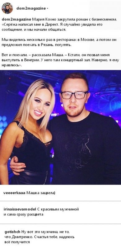 19 декабря 2017 года выяснилось, что в жизни Марии Кохно начался очередной роман, на этот раз девушка выбрала некоего рязанского бизнесмена. Надеждам Маши стать счастливой вместе с Дмитрием Дмитренко, который все еще состоит в браке с Ольгой Рапунцель, не суждено было сбыться. Вместо построения новых взаимоотношений с Марией Дмитрий принялся умолять супругу простить его и дать ему еще один шанс. К тому же теперь молодой мужчина вполне готов и опять вернуться на телестройку, где остается его супруга и в скором времени появится новорожденная дочь. Смотрите также: Дом 2 22 декабря 2017 вечерний и ночной Однако Кохно нисколько не расстраивается из-за этой ситуации, у девушки уже имеется новый поклонник, бизнесмен по имени Сергей, фотография которого уже размещена на просторах Интернета. Этот человек написал Марии в директ, после чего эти двое несколько раз поужинали вместе в столичных ресторанах и даже прогулялись по рязанским улицам. Правда, пока ни о каких серьезных взаимоотношениях между Кохно и появившимся у нее знакомым речь не идет. Но сама Маша не сомневается в том, что ее теперешний друг если не влюблен в нее, то, во всяком случае, неравнодушен к девушке. К тому же в скором времени она намеревается выступить в концертном зале, находящемся в Венгрии и являющемся собственностью Сергея. Впечатление от снимка и мнение о том, является ли этот представитель сильного пола подходящей парой для Марии Кохно, вы можете высказать в комментариях.