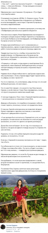 В интервью проектного журнала ситуацию сочла необходимым прояснить сама Ефременкова. Как утверждает девушка, сообщение Бузовой о том, что в ее отсутствие возлюбленный ведет переписку одновременно с двумя представительницами прекрасного пола, заставили ее принять окончательное решение о расставании с Сергеем. Подобную манеру вести себя со стороны ее уже бывшего бойфренда Юлия считает полнейшим предательством. К тому же теперь молодая женщина, как никогда прежде, желает иметь рядом по-настоящему достойного человека, тогда как репутация Кучерова давно запятнана постоянными изменами, и он никак не может являться для нее подходящей парой.