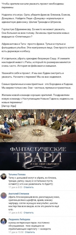 При этом предложения относятся не только к обитателям периметра, но и к проектным телеведущим. Как полагают зрители, настоящими профессионалами в этой команде являются лишь Влад Кадони и Ксения Бородина, тогда как остальных следует уволить с занимаемых должностей. Подробности этого плана все желающие могут увидеть на прилагаемом скриншоте.