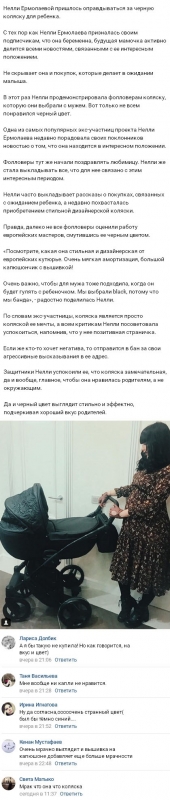 В то же время многим из подписчикам совсем не понравилась модель, которую предпочла Ермолаева. Они полагают, что коляска черного цвета, символизирующего траур, является абсолютно неуместной для новорожденного. К тому же данная вещь должна подходить в первую очередь для ребенка, а не для его родителей.