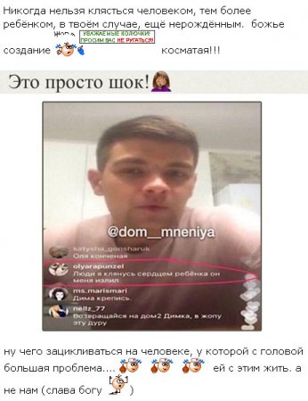 Даже зная о том, насколько богатым воображением обладает Ольга и в какой степени она склонна к разнообразным фантазиям, приверженцы телепрограммы все же не могли поверить, что она способна совершить столь низкий и некрасивый поступок. В комментариях к прямому эфиру, проводимому в социальной сети Инстаграм, молодая женщина снова подчеркнула, что Дмитренко поднимал на нее руку. Для того чтобы ее сообщение было более убедительным, будущая мать решилась поклясться своим еще не пришедшим в этот мир ребенком. Ее клятва глубоко возмутила посетителей социальных сетей, единодушно объявивших о том, что для Рапунцель просто уже не существует ничего святого.