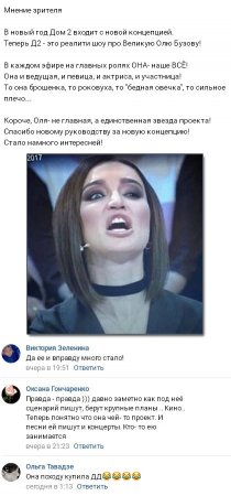 Стоит обратить внимание на то, что большинству поклонников программы не слишком нравится подобное возвеличение Ольги. Многие просят организаторов телепроекта одуматься, зрители даже угрожают прекратить просмотр эфиров телепередачи, если в центре внимания по-прежнему всегда станет оставаться Бузова.