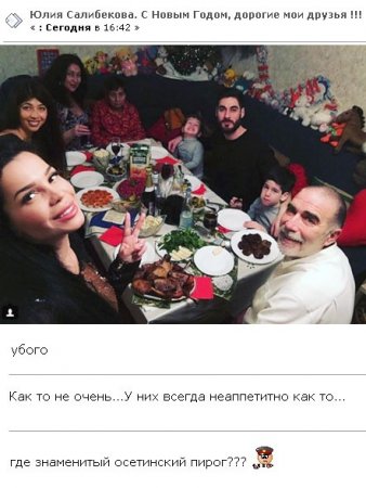 2 января 2018 года поклонники телешоу искренне удивились тому, за каким чрезвычайно скромным и даже, можно сказать, убогим столом семья Тиграна и Юлии Салибековых провела ночь наступления нового года. Совсем недавно Юлия Колисниченко-Салибекова поделилась с подписчиками намерением встретить этот значимый праздник вместе с родственниками супруга в Моздоке. Она не стала скрывать и того факта, что она и ее муж опоздали на нужный им поезд, в результате чего все их путешествие едва не оказалось сорванным. Смотрите также: Дом 2 дневной вечерний ночной все выпуски Однако Новый год Салибековы все же встретили вместе с детьми, как они и стремились, в кругу самых близких для них людей. Юлия даже выложила в Сеть первый семейный фотоснимок, сделанный уже в наступившем году и от души поздравив всех своих фанатов. Но молодая женщина едва ли могла ожидать многочисленных критических замечаний по поводу данной фотографии. Зоркие подписчики сразу же увидели, насколько простым и непритязательным был праздничный стол этого семейства. Некоторые без стеснения назвали его просто убогим. Юлии, Тимуру и его родным не предлагалось никаких модных салатов или закусок. Более того, женщины указанной семьи не стали доставлять себе даже лишних хлопот с салфетками и скатертью. Впечатление от снимка и мнение о том, действительно ли Салибековы встретили Новый год отнюдь не самым лучшим образом, вы можете изложить в комментариях.
