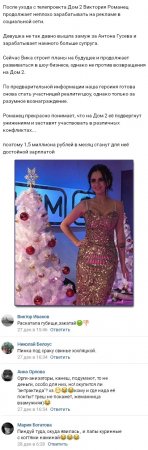 Оставив телепроект, Вика нисколько не скрывает от подписчиков, что такие изменения в жизни стали для нее исключительно полезными, причем речь идет не только о брачном союзе с Антоном Гусевым. Как утверждает Романец, ее доходы от рекламы в социальной сети Инстаграм, которыми она, в отличие от обитателей периметра, вовсе не должна делиться с организаторами телепрограммы, в несколько раз превышают ее прежнюю зарплату на телепередаче. К тому же заработки молодой женщины являются даже более высокими, чем у ее мужа.