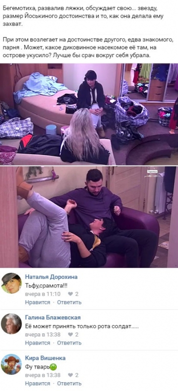 Но после того, как Саша в присутствии Миши завела речь о своем предыдущем бойфренде, заговорив при этом о физических контактах с другим мужчиной, почти никто не сомневается в том, что Вырский не станет долго находиться рядом с Александрой. В ходе одного из последних эфиров Черно, устроившись на коленях теперешнего друга, без стеснения сообщила ему о весьма крупном размере основного органа Иосифа, рассказав и о том, насколько некомфортно она себя чувствовала во время их первой близости.