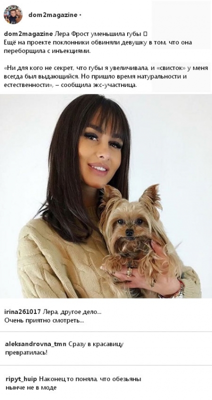 9 января 2018 года фанаты не стали скрывать своего однозначно положительного отношения к трансформациям Валерии Фрост. Внешний вид этой девушки, нисколько не сомневавшейся в собственном обаянии и неотразимости, неоднократно подвергалась язвительной критике со стороны поклонников реалити-шоу. В частности, почти никому не по душе чрезмерная худоба Леры или ее чересчур перекаченные губы, напоминающие с виду весьма крупные пельмени. Смотрите также: дом 2 12.01.18 дневной вечерний ночной Однако Фрост приняла решение навсегда расстаться с силиконом в губах. Неожиданно для всех окружающих Валерия вознамерилась уменьшить собственные губы и вернуть им естественные размеры. По словам самой молодой женщины, для нее наступила поры обычной, данной ей от природы красоты. К тому же Лера твердо пообещала в дальнейшем вести себя более осторожно при попытках измениться с помощью пластической хирургии либо распространенных сегодня уколов красоты. Стоит отметить, что многим приверженцам телестройки искренне понравилось теперешнее преображение Фрост. По мнению многих, бывшая участница телепрограммы сейчас действительно похорошела и, наконец, кажется симпатичной девушкой, а не неким перекачанным трансвеститом. Впечатление от снимка и мнение о том, действительно ли Валерия Фрост стала выглядеть значительно лучше, вы можете высказать в комментариях.