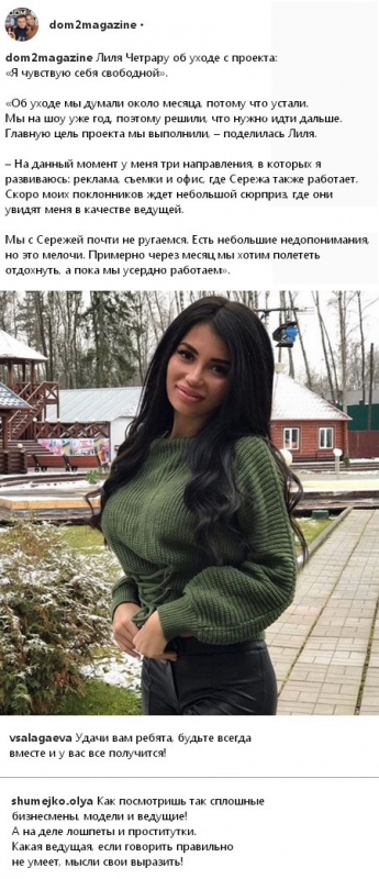 16 января 2018 года Лилия Четрару с гордостью рассказала подписчикам об отличной работе, которую девушка сумела отыскать сразу после расставания с телепроектом. Многие из фанатов реалити-шоу искренне удивились, услышав о том, что пара Сергея Захарьяша и Лилии Четрару вознамерилась оставить телестройку. Но теперь, когда уход из периметра для этих молодых людей уже стал прошлым, Лиля нисколько не скрывает того факта, что она и Сергей готовились уйти с телепрограммы не менее месяца и сейчас нисколько не раскаиваются в том, что приняли именно такое решение. Смотрите также: дом 2 20/01/2018 дневной Более того, жизнь этих двоих только после ухода с телепередачи обрела новые яркие краски и множество радостей. Все прежние разногласия и конфликты между Захарьяшем и Четрару полностью прекратились. К тому же, хотя большинство поклонников телешоу и предсказывали этим двоим безработицу вне периметра, девушка и ее бойфренд теперь вовсе не сидят без дела. Молодой человек выбрал для себя обыкновенную службу клерком в офисе, тогда как Четрару уверенно развивается одновременно в трех направлениях. Основным источником дохода для бывшей участницы телестройки сейчас являются съемки и рекламная деятельность. При этом Лилия параллельно работает в одном офисе с возлюбленным, а в дальнейшем она намеревается попробовать свои силы и в роли телевизионной ведущей. Свое мнение о том, как складывается судьба Лилии Четрару и Сергея Захарьяша после того как они оказались за пределами телепередачи, вы можете высказать в комментариях.
