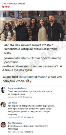 Однако сами Самсонов и Устиненко пока не дали общественности подтверждения существующей между ними любовной связи. Но это нисколько не препятствует подписчикам выдвигать различные предположения по данному поводу. В частности, многие полагают, что семейная жизнь Алексея и Юлии пострадала именно из-за Алианы, которая всячески стремилась разрушить их брак, не придавая никакого значения существованию малыша, которому в дальнейшем придется расти без отца.