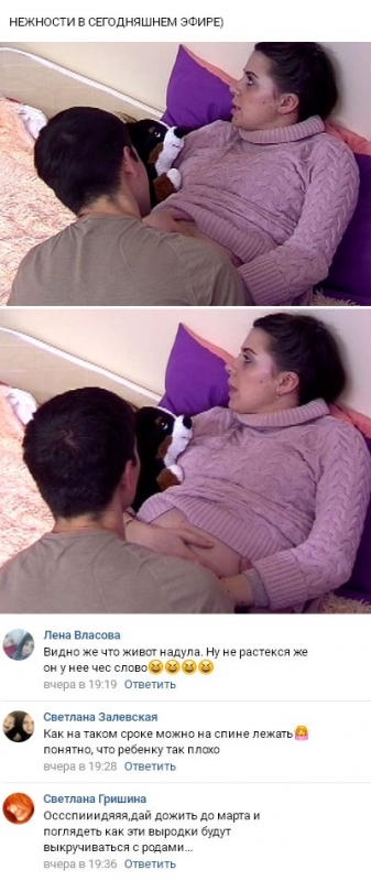 25 января 2018 года из-за неожиданного проявления Дмитрием Дмитренко особой нежности по отношению к Ольге Рапунцель перед зрителями явственно «засветился» ее живот. Уже на протяжении нескольких месяцев фанаты телестройки настаивают на том, чтобы Ольга продемонстрировала всем свой живот и доказала таким образом, что действительно готовится стать мамой. Причина подобного недоверия заключается в том, что телезрители давно привыкли к постоянной лжи Рапунцель, и теперь они не желают поверить и в ее «интересное положение». Более того, многие из них усиленно ищут и даже обнаруживают доказательства того, что молодая женщина всего лишь носит под одеждой особую накладку для имитации беременности. Смотрите также: дом 2 вечерняя и ночная серии Даже во время последней фотосессии Ольга ловко скрыла выступающий живот под рисунком. Исходя из того, как внезапно пропал ее обычно выпирающий пупок, поклонники телепроекта решили, что и на фотографиях она была запечатлена при наличии накладки. Но все сомнения удалось развеять Дмитрию Дмитренко, причем абсолютно непредумышленно. В ходе одного из недавних эфиров молодой человек настолько старательно целовал и обнимал супругу, что в кадре оказался и обнаженный живот Рапунцель. Однако и теперь имеются те, кто не желает поверить в очевидность происходящего. В частности, живот Ольги представляется недоброжелателям явно надутым и при этом расплывшимся неестественным образом, он не кажется им типичным для беременной. Впечатление от снимка и мнение о том, появится ли все же у Ольги Рапунцель в ближайшее время ребенок, вы можете изложить в комментариях.