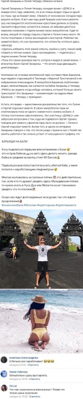 Пара немедленно продемонстрировала фанатам первые фотографии, сделанные в ходе отпуска. При этом Сергей твердо пообещал и далее радовать подписчиками снимками достопримечательностей, которые они с подругой обязательно намереваются посетить в ближайшие дни. Правда, Захарьяш уже успел и выразить недовольство не слишком чистыми местными пляжами, пожаловался и на то, что ему пытались дать в аренду уже поврежденный байк.