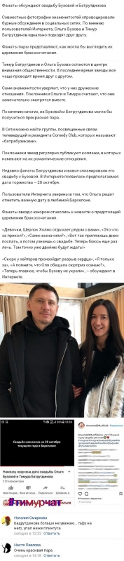 Стоит заметить, что многим людям союз Тимура и Ольги действительно кажется отличным, фактически безукоризненным вариантом. К тому же в виртуальном пространстве не перестают создаваться новые группы, посвященные именно их красивым и трогательным взаимоотношениям. Страстные поклонники пары даже сочинили хештег #батрабузики и теперь фантазируют о том, когда же может состояться роскошная свадьба резидента Камеди Клаб и телеведущей.