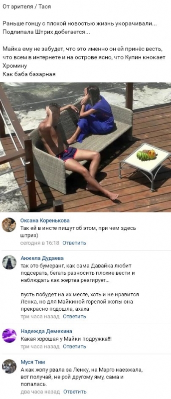 9 февраля 2018 года Майе Донцовой стала известна весьма неприятная новость, касающаяся интимной близости между Алексеем Купиным и Еленой Хроминой, что уже достаточно давно не перестает обсуждаться пользователями «всемирной паутины». Едва фанаты телешоу немного успокоились после событий в любовном треугольнике, сложившемся между Маргаритой Овсянниковой, Саймоном Марданшиным и Еленой Хроминой, как Лена немедленно поспешила вмешаться и во взаимоотношения в другой паре. Однако до недавнего времени об этой ситуации почти никто не знал в точности, да и сама Хромина вовсе не афишировала того факта, что позволяет себе сексуальные контакты с чужим возлюбленным. Смотрите также: дом 2 12.02.2018 вечерний выпуск Всем отлично известно о том, что едва ли не единственным человеком, поддержавшим Елену после ее болезненного разрыва с Марданшиным, являлась именно Майя Донцова. Именно по этой причине близость Хроминой с бойфрендом Майи Алексеем Купиным просто шокировала большинство поклонников телевизионной передачи. Сама девушка также никак не могла ожидать подобного предательства от приятельницы и любимого мужчины. Однако, исходя из слов Андрея Штриха, обитатели периметра и телезрители давно в курсе того, что Лена и Леша симпатизируют друг другу. По мнению молодого человека, весьма странным кажется то, что Донцова в течение столь длительного времени так ничего и не заметила. Свое мнение о взаимоотношениях Алексея Купина с Еленой Хроминой и о том, как в создавшейся ситуации необходимо поступить Майе Донцовой, вы можете высказать в комментариях.
