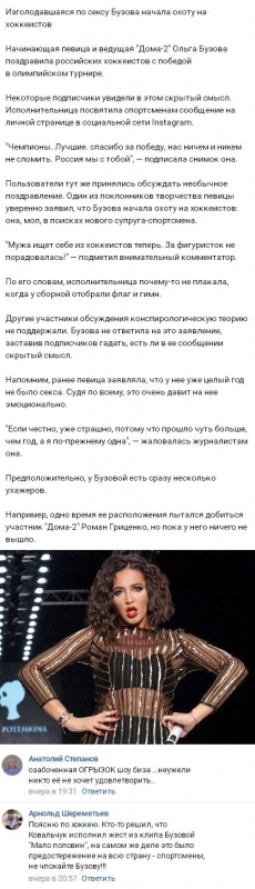 Как полагают подписчики телеведущей, Бузова отнюдь не случайно решила обратиться именно к представителям сильного пола, задействованным в этом виде спорта, никак не отметив достижения хоккеисток. Поклонники Ольги вполне допускают, что она жаждет физической близости и теперь просто охотится за хоккеистами, стремясь отыскать для себя не только временного ухажера, но и настоящего жениха.