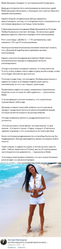 Но, по словам самой Майи, она уже находится на грани. Если положение вещей не изменится, девушка действительно превратится в подлинную анорексичку. Выяснилось, что при росте в 170 сантиметров ее вес составляет всего 47 килограммов. При этом последние 5 килограммов, ведь совсем недавно Донцова весила 52 килограмма, она потеряла фактически за пару дней.