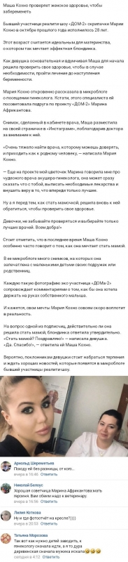 19 марта 2018 года Мария Кохно не стала скрывать от поклонников того факта, что она уже теперь серьезно готовится к тому, чтобы ее будущая беременность протекала без всяких осложнений. Хотя девушка и прилагала все усилия к построению полноценных взаимоотношений на телестройке, Маша все же потерпела полную неудачу. Вне пределов периметра личная жизнь Марии также складывается не самым оптимальным образом. Ее симпатии к Дмитрию Дмитренко не привели ни к каким результатам, не получилось у Кохно и сколько-нибудь длительного романа с Ильей Яббаровым. Смотрите также: дом 2 за 22 марта 2018 вечерний и ночной эфир Но многочисленные провалы на данном фронте нисколько не препятствуют стремлению Маши к материнству. Исходя из последних сообщений от самой молодой женщины, уже в ближайшее время ее мечты о ребенке могут воплотиться в реальности. Выяснилось, что уже сейчас девушка проходит детальное гинекологическое обследование и не собирается надолго откладывать решение вопроса о беременности. К тому же сейчас Марии 28 лет, и этот возраст является наиболее подходящим для рождения малыша. Стоит обратить внимание и на то, что на протяжении последнего времени Кохно не упускает возможности поговорить о радостях семейной жизни, а также о том, какое счастье приносит женщине материнство. К тому же страничка Маши в социальной сети Инстаграм наполнена фотоснимками, на которых запечатлены дети. При этом сама Мария абсолютно не против позаботиться не только о собственных племянниках, но и об отпрысках приятельниц. Свое мнение о том, действительно ли Мария Кохно планирует в самом скором времени стать мамой, вы можете высказать в комментариях.