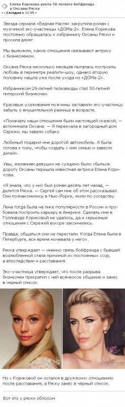 Но счастье Ряски продолжалось совсем недолго, причем препятствием оказалась известная в прошлом актриса Елена Корикова. Как утверждает молодая женщина, Елена регулярно обращалась к ее возлюбленному за финансовой и моральной поддержкой, хотя ее взаимоотношения с этим мужчиной завершились еще около десяти лет назад.