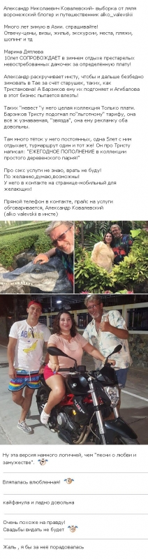По словам одной из землячек Ковалевского, этот человек зарабатывает себе на безбедное существование тем, что сопровождает в Таиланд состоятельных женщин, причем Марина Тристановна стала лишь одной из многих в этом ряду. К тому же для нее услуги такого гида не потребовали оплаты, скорее всего, только из-за того, что Александр стремится максимально раскрутить свою страничку в социальной сети Инстаграм. При этом в подобных заработках мужчины оказался замешанным Иван Барзиков. Именно этот молодой человек находит обеспеченных клиенток для Ковалевского, получая за свою помощь неплохой процент.