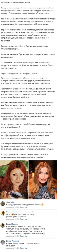 Однако Лена Миро, скандально знаменитая блогерша, твердо убеждена в том, что Орлова бессовестно лжет. Как полагает Лена, именно перекаченную Ольгу можно считать настоящей антирекламой для сферы пластической хирургии. К тому же на лице проектной ведущей давно уже нет ни одной собственной, природной черточки, идет ли речь о носе либо о ямочках на щеках. Отличным доказательством подобных утверждений являются фотоснимки Оли, относящиеся к периоду начала ее карьерного пути в творчестве.