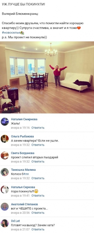 При этом Валерий резко опроверг все сплетни, касающиеся его ухода с телепроекта в ближайшее время. Он особо подчеркнул тот факт, что квартира необходима ему и Тате для иных целей. Однако, как полагают приверженцы телешоу, Блюменкранц допускает, что их с женой могут в любую минуту попросить оставить телепрограмму, и старается заранее подготовиться к подобному повороту событий.