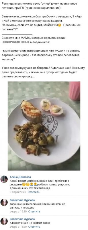 Явную ошибку допустила сама молодая женщина, опубликовав на просторах «мировой паутины» видеозапись, на которой Ольга не только продемонстрировала свой обед, но и позволила себе определенные комментарии. Выяснилось, что Рапунцель, поклонница грудного вскармливания детей, приняла решение придерживаться правильного режима питания. Однако женщина по каким-либо причинам не задумалась о том, что майонез и жареные грибы являются вовсе не самыми подходящими продуктами для кормящей матери.