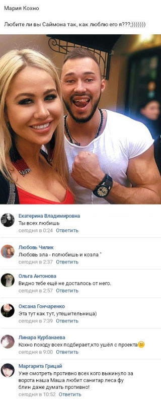 10 апреля 2018 года в виртуальном пространстве появились новые сплетни, касающиеся романтических взаимоотношений Марии Кохно с прежним возлюбленным Елены Хроминой. После ухода с телестройки Маша все еще не сумела полноценно устроить собственную личную жизнь. Правда, молодая женщина нисколько не теряет надежды встретить предназначенного ей судьбой представителя сильного пола за пределами периметра. Однако пока Кохно выбирает для себя исключительно бывших участников реалити-шоу, таких же, как и она сама. Смотрите также: дом 2 дневной вечерний и ночной выпуск за 13/04/2018 Всего полгода назад Мария без стеснения встречалась с Дмитрием Дмитренко. Ее нисколько не смущал тот факт, что молодой мужчина в это время уже давно состоял в браке и готовился к роли отца. Теперь фанаты подозревают, что у Маши завязался роман с Саймоном Марданшиным. Уже на протяжении нескольких дней эти двое охотно размещают в Интернете совместные фотографии. Более того, девушка и сама дала понять окружающим, что неравнодушна к этому парню, хотя и сделала такое признание в шутливой форме. Впечатление от снимка и мнение о том, действительно ли Мария Кохно и Саймон Марданшин стремятся стать настоящей парой, вы можете высказать в комментариях.