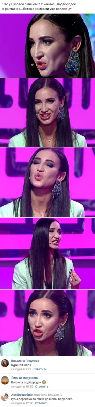 9 апреля 2018 года недоброжелатели ехидно подчеркнули тот факт, что у телеведущей Ольги Бузовой явно наличествуют определенные трудности. В течение длительного времени Ольга постоянно и с гордостью говорила о том, что является полностью «натуральной», не прибегая ни к каким пластическим ухищрениям. В отличие от большинства товарищей по сфере шоу-бизнеса, Бузова не только категорически не желала менять размер груди или увеличивать губы за счет уколов, но и не слишком часто посещала специалистов-косметологов. Смотрите также: дом 2 11 апреля 2018 Но как только Дмитрий Тарасов предпочел завершить их отношения, ситуация немедленно стала совершенно иной. Многие из окружающих замечают, что Оля быстро становится другой, причем трансформации осуществляются отнюдь не в лучшую сторону. Проблема заключается не только в том, что телеведущая все меньше напоминает внешне прежнюю себя. На одной из последних фотографий заметно, что ботокс, который женщина вкалывает себе ради большей привлекательности, в области ее подбородка буквально свернулся комками. Со стороны подобное зрелище однозначно не кажется особенно красивым, не говоря уже о риске возникновения сложностей со здоровьем и иных весьма неприятных последствиях. Впечатление от снимка и мнение о том, действительно ли Ольга Бузова слишком злоупотребляет искусственными методами для улучшения собственной внешности, добиваясь в итоге обратного эффекта, вы можете изложить в комментариях.