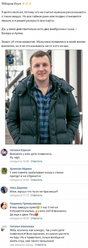 Многие чрезвычайно удивились, когда сам Илья счел нужным заговорить о своих отпрысках, появившихся у него вне брака, ведь в течение длительного времени он категорически все отрицал. Большинство фанатов телепрограммы поразились, услышав о том, что у Яббарова на самом деле имеются два сына. Правда, на протяжении долгого периода Илья не считал возможным объявлять об этом во всеуслышание.