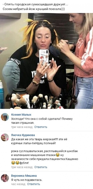 Ведущую без всяких церемоний назвали «мерзкой тварью», у нее также принялись издевательски интересоваться, почему она настолько страшна. В этом нет ничего удивительного, ведь непричесанная Бузова с ее прядями рыжего цвета на фоне черных волос действительно может показаться настоящим персонажем из кинофильма ужасов.