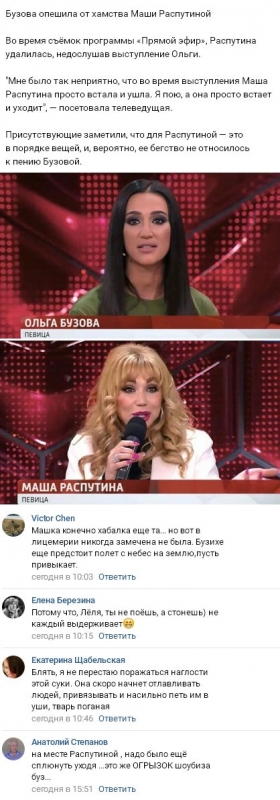 Но едва ли Оля предполагала, что фактически то же самое произойдет и в ходе съемок телепрограммы «Прямой эфир». В частности, Мария Распутина, находящаяся в студии, поднялась и ушла, причем именно в минуты исполнения Бузовой ее композиции. Ольга не стала отрицать, что выходка знаменитой певицы была для нее крайне оскорбительной и Маша поступила чрезвычайно некрасиво по отношению к ней. Телеведущая даже не пыталась сдерживать отрицательных эмоций, вызванных создавшейся ситуацией.