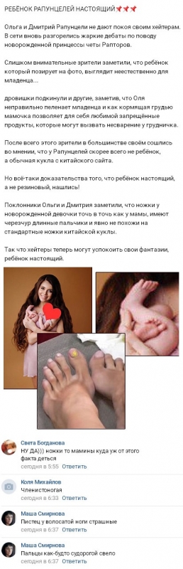28 апреля 2018 года посетители социальных сетей, наконец, получили явные доказательства того, что в семье Ольги Рапунцель и Дмитрия Дмитренко обитает настоящий, живой младенец. Недоброжелатели, до самых родов не желавшие верить в то, что Оля действительно готовится к материнству, в дальнейшем утверждали, что малышка, которую Рапунцель и Дмитренко демонстрируют окружающим, не является подлинным ребенком. В частности, многие полагали, что девочка, находящаяся на руках Ольги, на самом деле представляет собой куклу, приобретенную с помощью известного китайского сайта. Хотя до определенного момента Рапунцель и удается всех обманывать, но рано или поздно, как считали хейтеры, ее ложь неминуемо откроется. Но на ряд вопросов были получены ответы, когда в виртуальном пространстве появилась фотография дочери Дмитрия и Ольги, которая уже немного подросла. Внимательные фанаты телешоу присмотрелись к стопам младенца и к довольно корявым пальчикам девочки, после чего люди все же перестали сомневаться. Теперь многим совершенно ясно, что малышка Рапунцель и Дмитренко не только настоящая, но и напоминает внешне свою маму, во всяком случае, в отношении ног. Свое мнение о том, стоит ли кому-либо продолжать говорить о том, что в семействе Дмитрия Дмитренко и Ольги Рапунцель нет живого ребенка, вы можете высказать в комментариях.